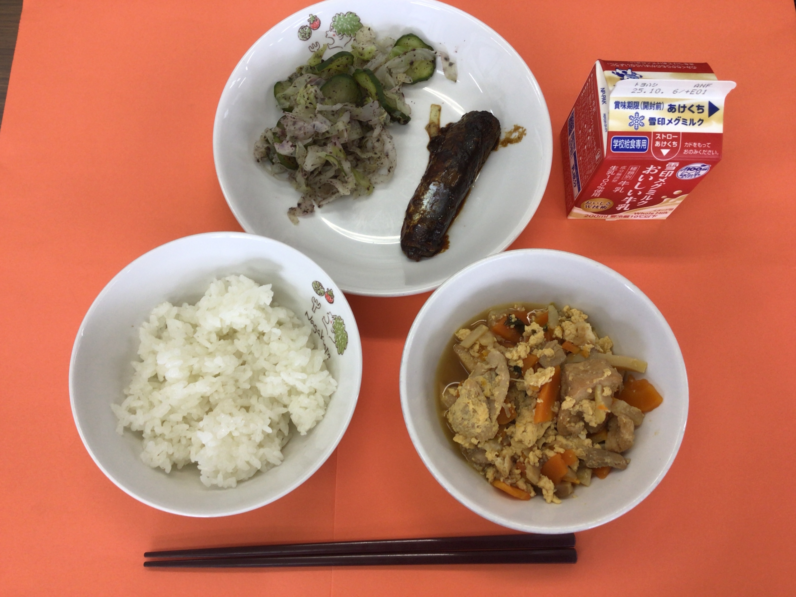 今日の給食はご飯、牛乳、いわし八丁みそ煮、赤しそあえ、生揚げの卵とじでした。