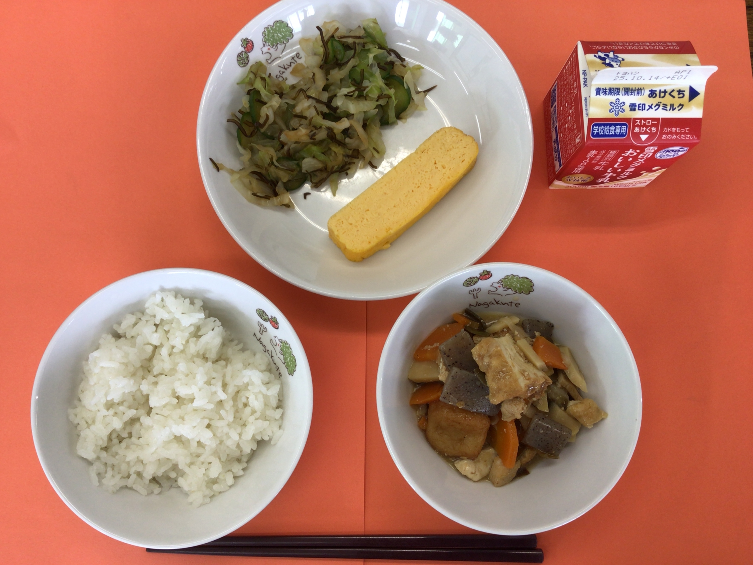 今日の給食は、ご飯、牛乳、厚焼き卵、塩昆布あえ、吉野煮でした。