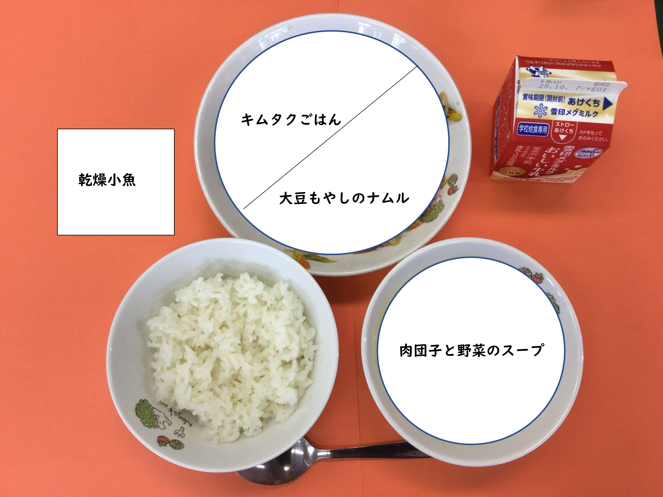 今日の給食は、ご飯、牛乳、キムタクごはんの具、大豆もやしのナムル、肉団子と野菜のスープ、乾燥小魚でした。