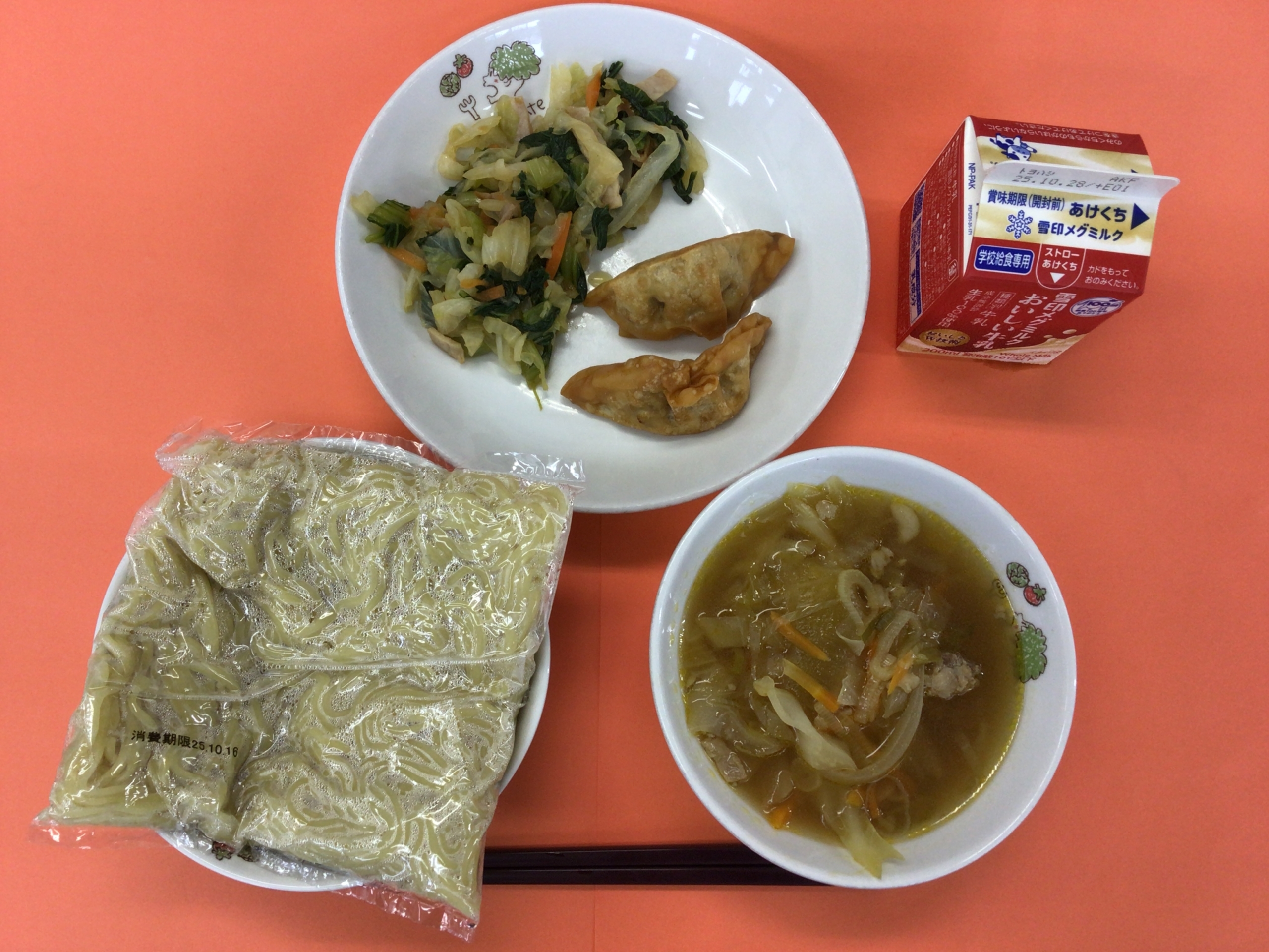 今日の給食は、中華めん、五目ラーメン、揚げぎょうざ、チンゲンサイの中華あえでした。