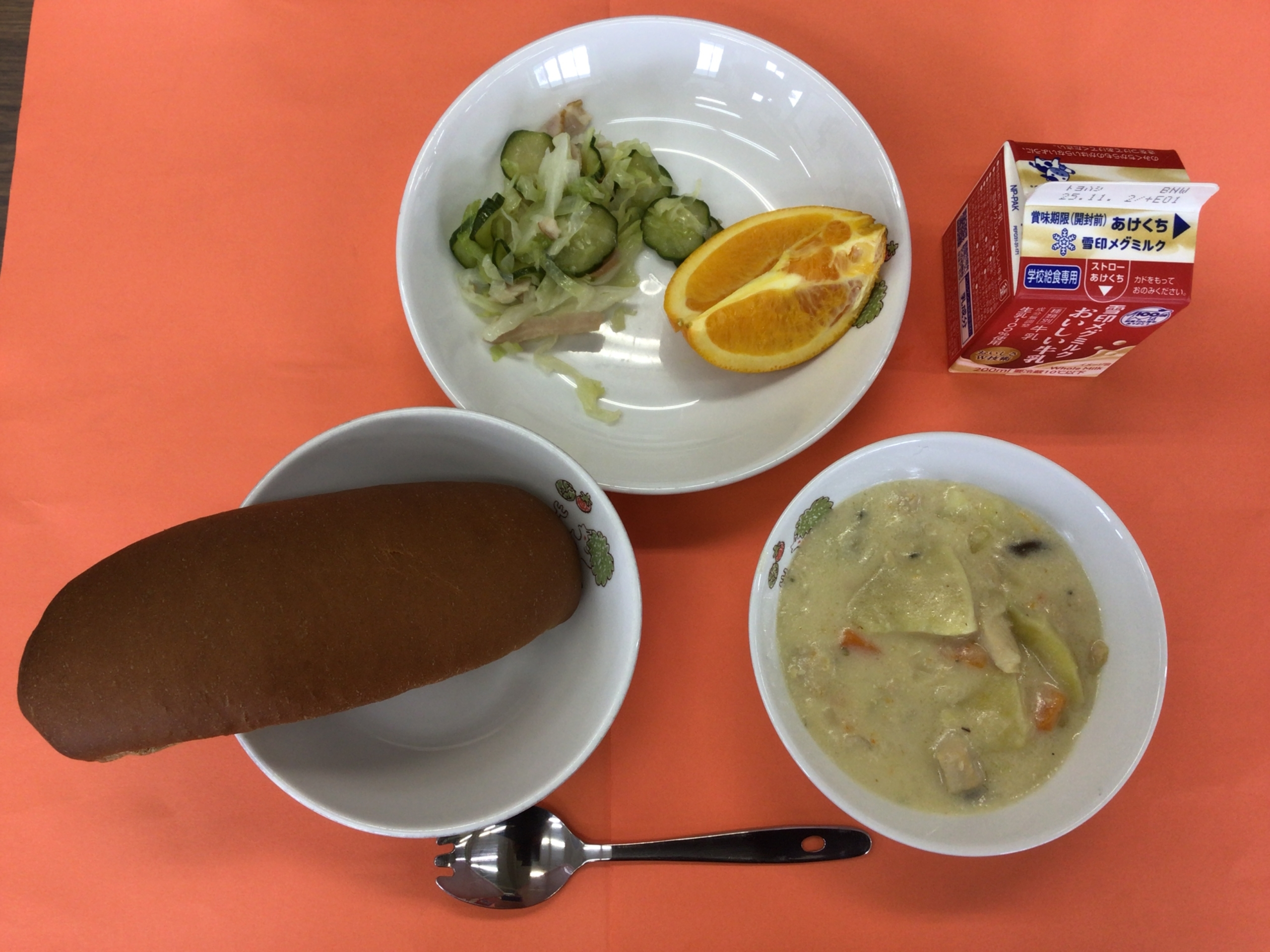 今日の給食はクロスロールパン、牛乳、さつまいものクリーム煮、グリーンサラダ、オレンジでした。