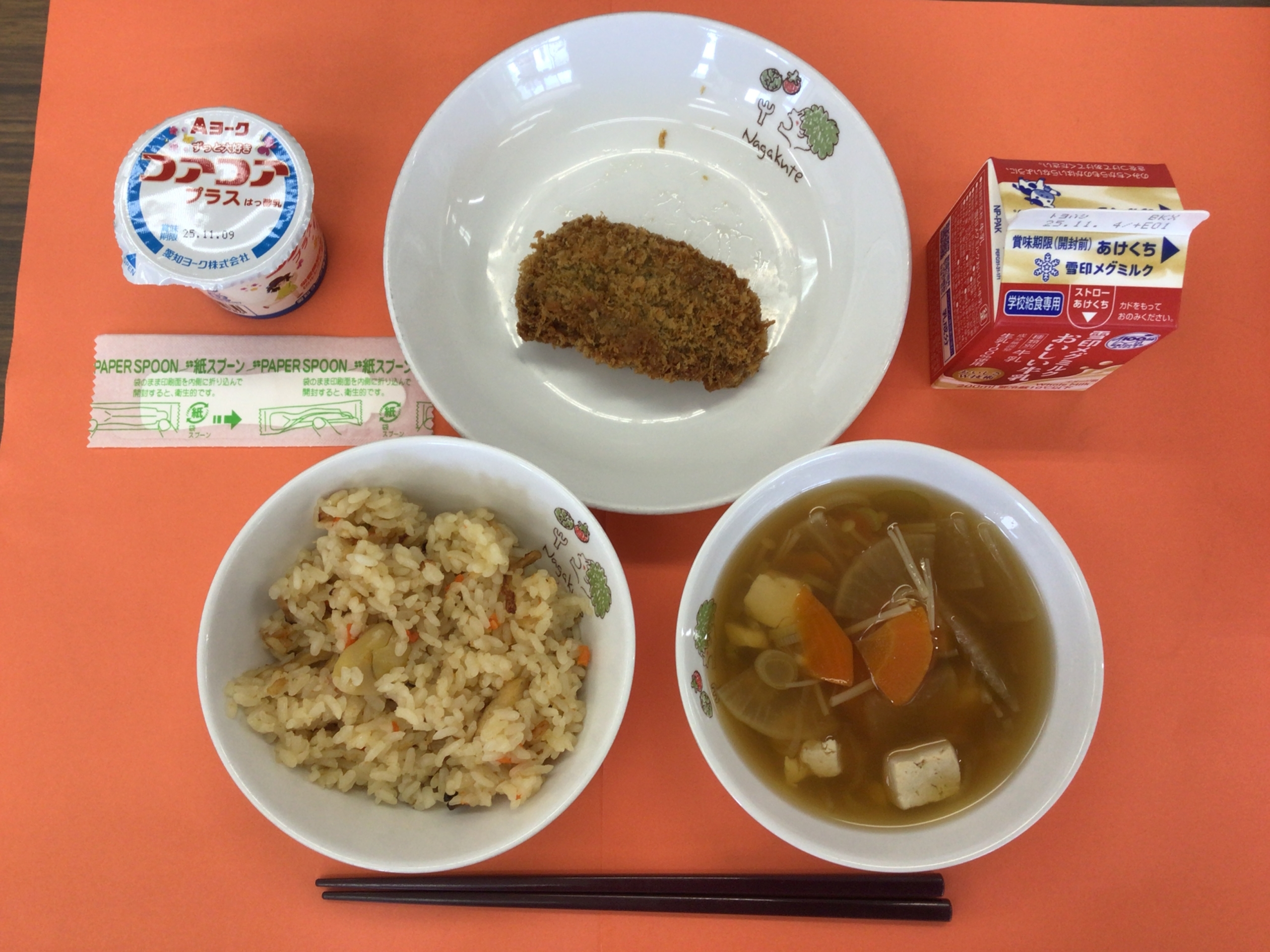 今日の給食は、くりおこわ、牛乳、あじの磯部フライ、とうふ汁でした。