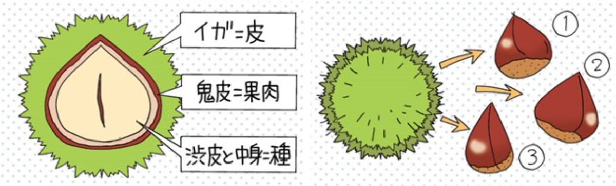 栗は一つのいがの中に通常3個入っており、食べることのできる皆さんが思っている果肉の部分は、実は栗の種です。