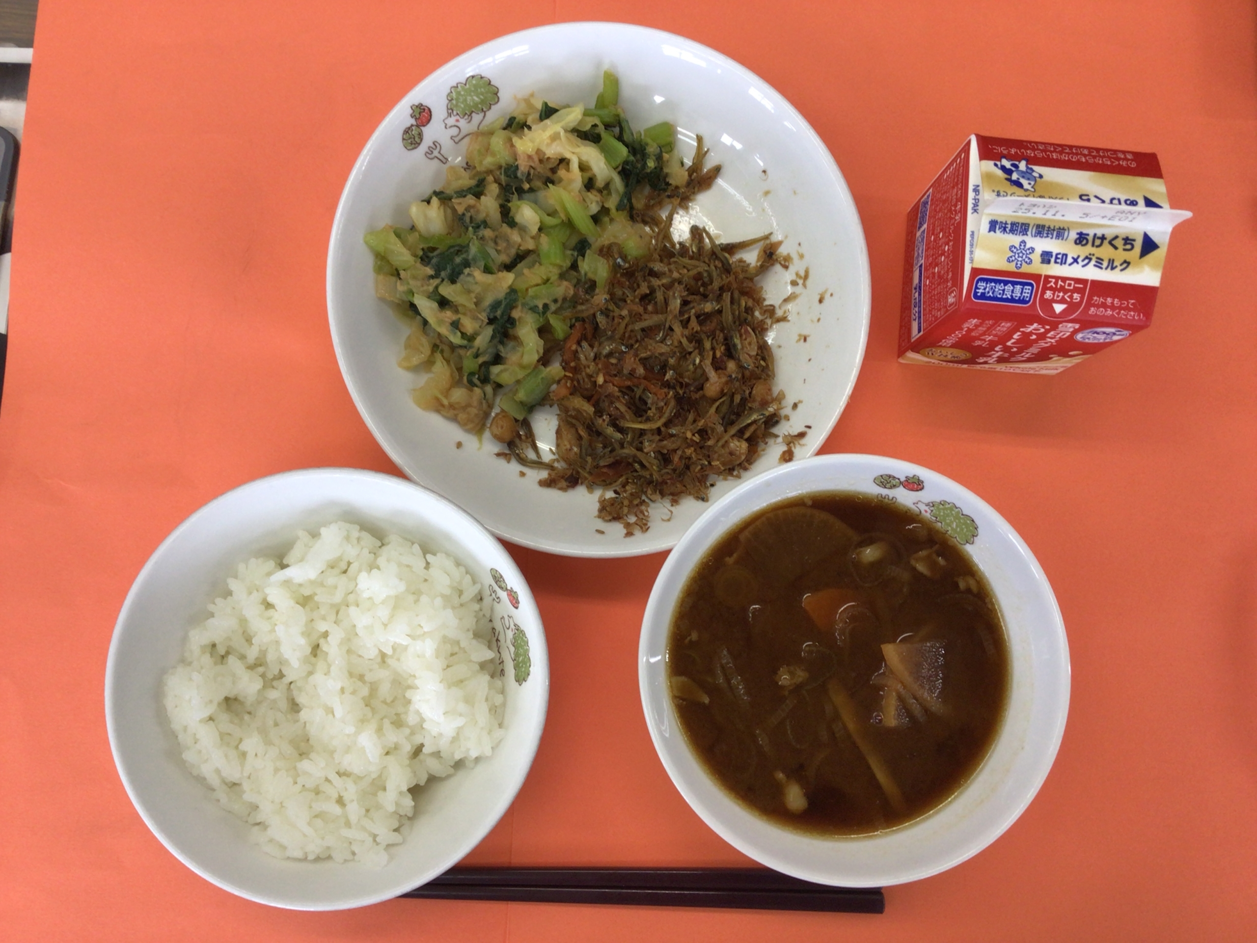 今日の給食は、ご飯、牛乳、豆じゃこごはん、キャベツとツナのあえもの、豚汁でした。