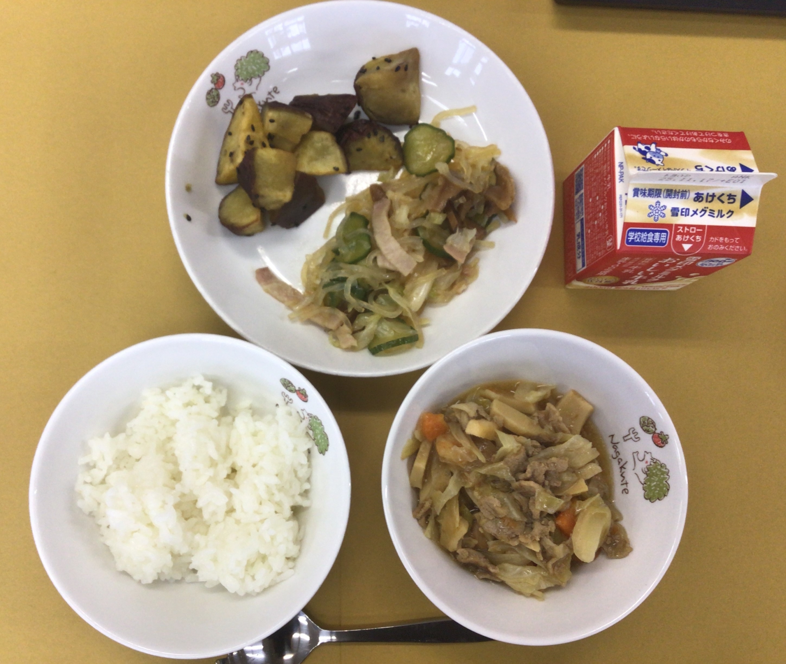 今日の給食は、ご飯、牛乳、中華飯、はるさめサラダ、大学芋でした。