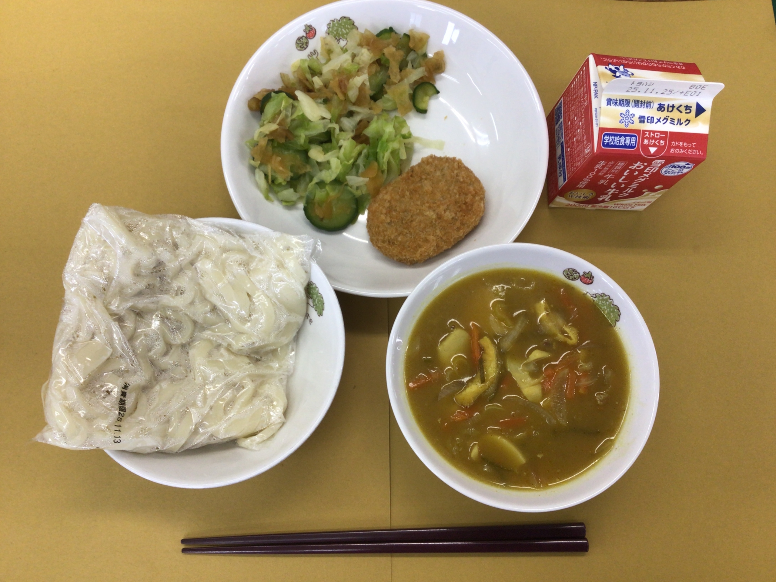 今日の給食は、袋入りうどん、カレーうどんの汁、福神漬けサラダ、さつまいもコロッケでした。