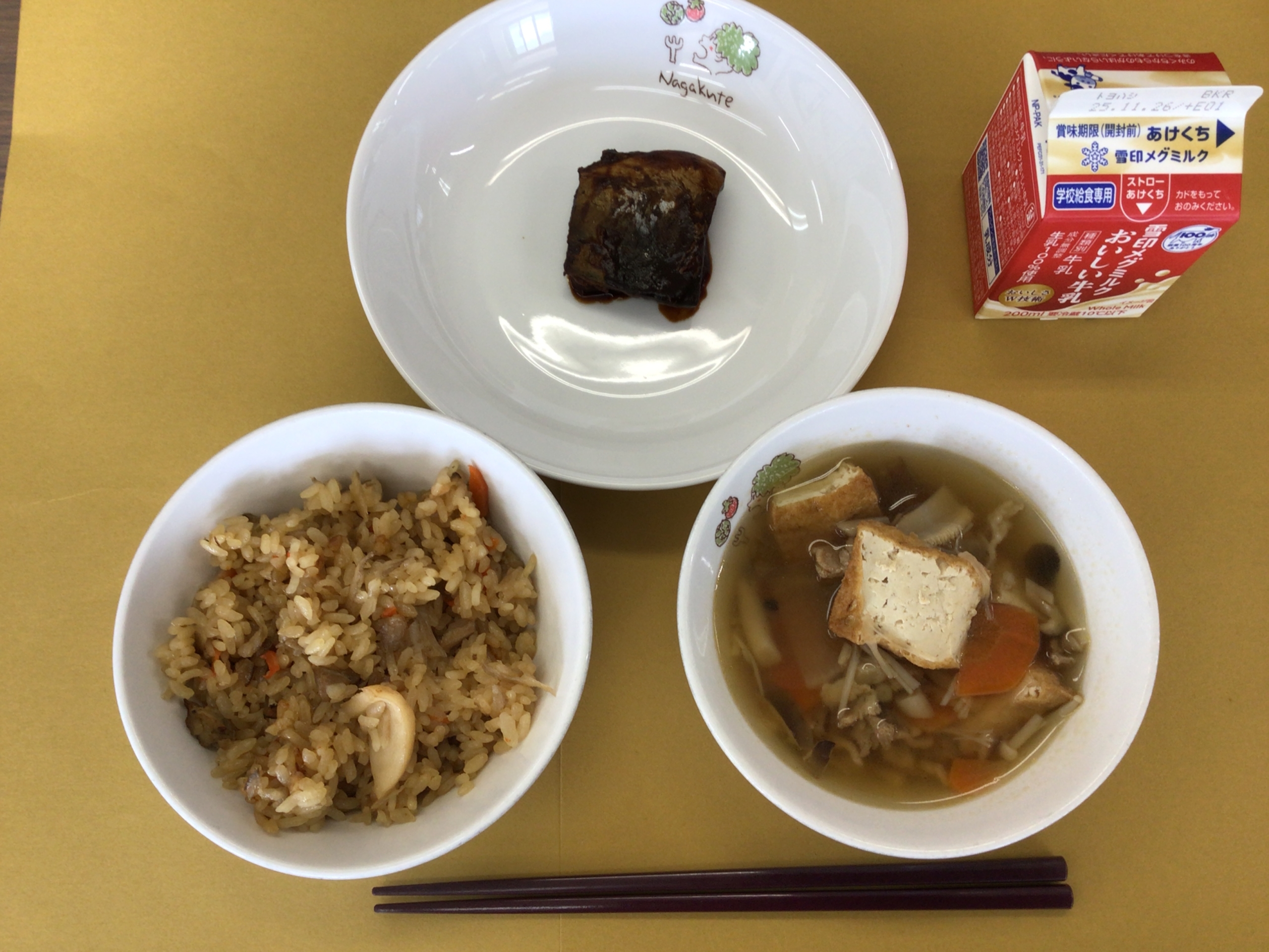 今日の給食はごもく御飯、牛乳、さばの八丁みそ煮、きのこ汁でした。