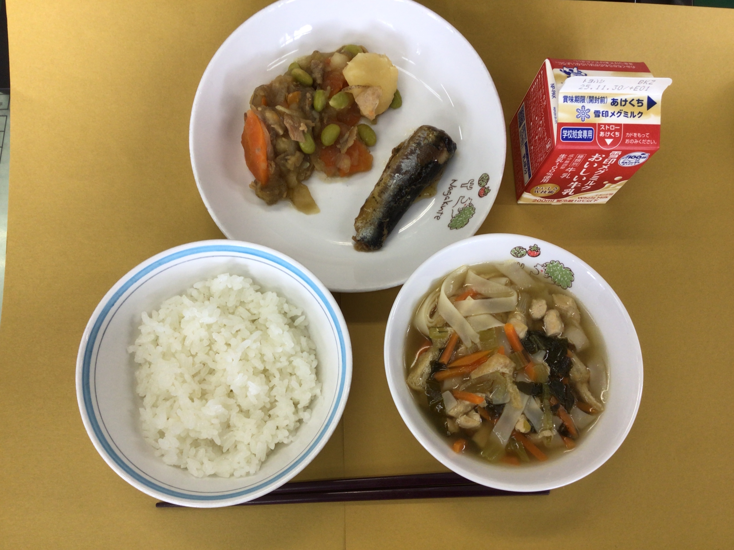 今日の給食はご飯、牛乳、いわしの生姜煮、肉じゃが、きしめん汁でした。