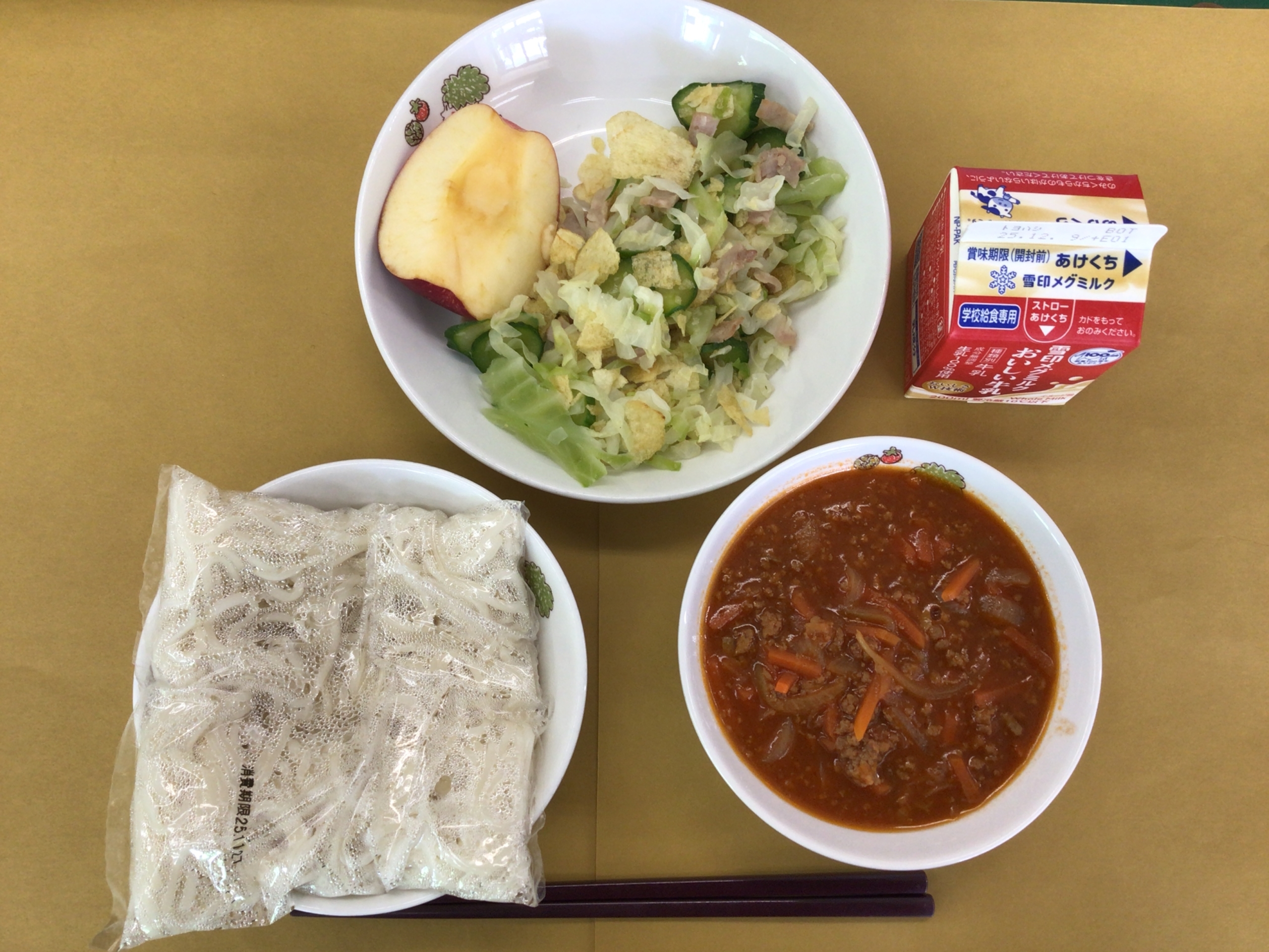 今日の給食はソフトめん、ミートソース、ポテトチップスサラダ、りんごでした。