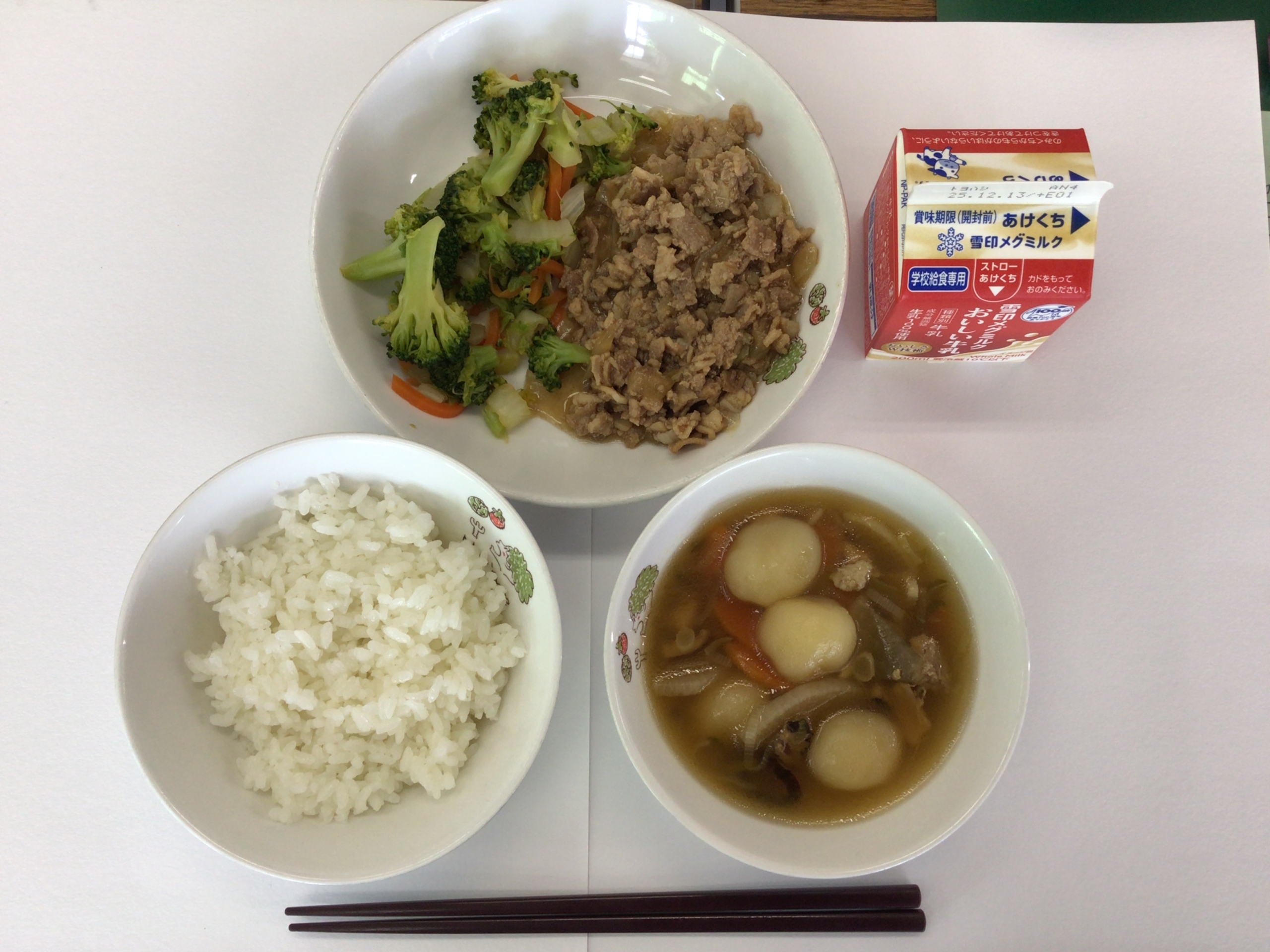 今日の給食はごはん、牛乳、豚肉のしょうが炒め、ブロッコリーのおひたし、だんご汁でした。