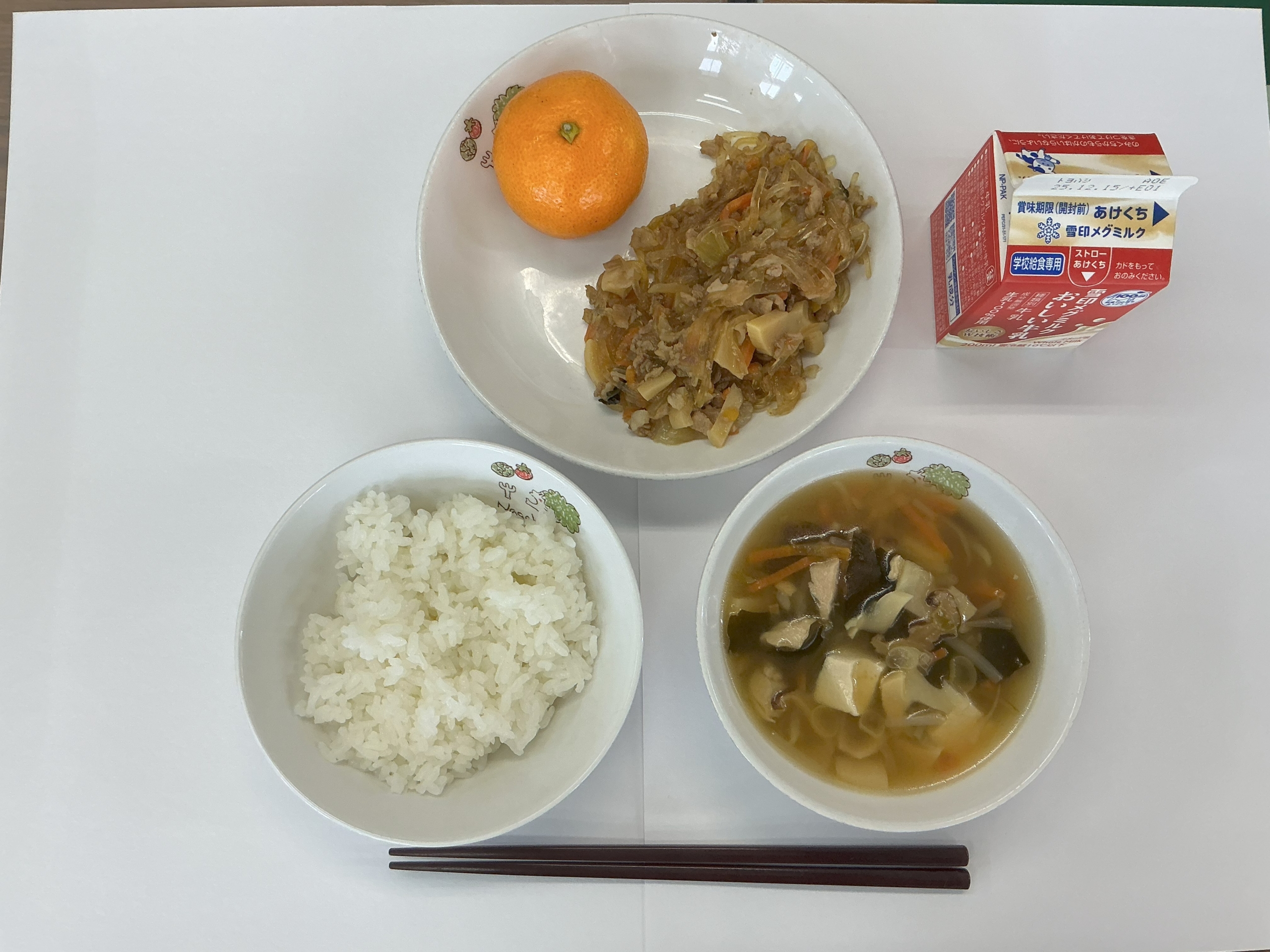 今日の給食は、ごはん、牛乳、はるさめと野菜の炒め煮、中華とうふ汁、みかんでした。