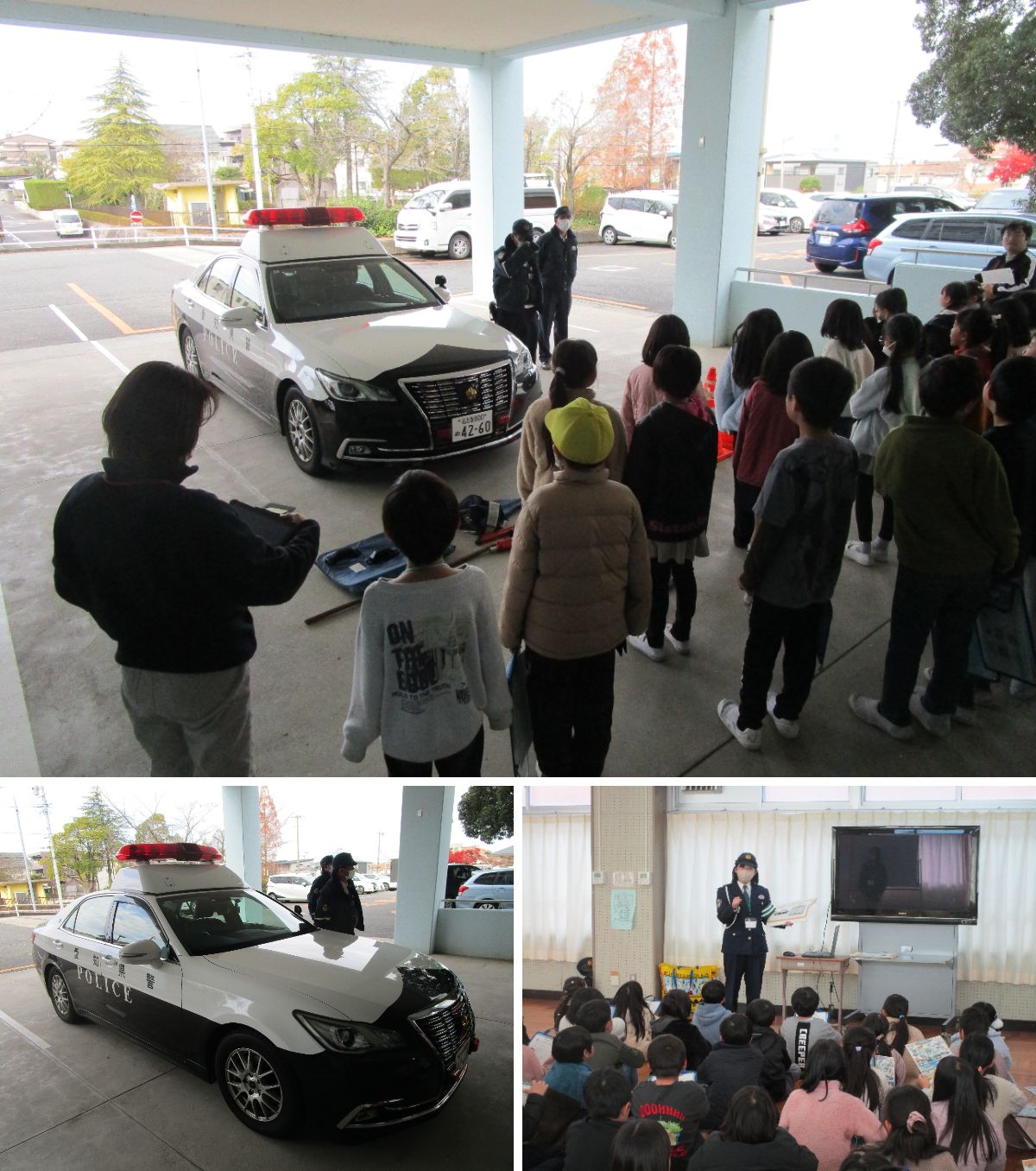 児童は、実際のパトカーや警察が使用するさまざまな装備を見せていただき、犯罪や事故から人々を守るための工夫について学びました。