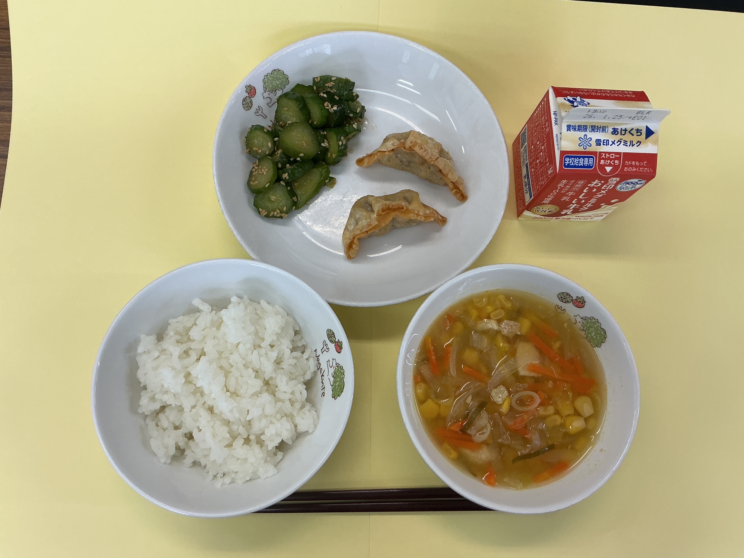 今日の給食は、ごはん、牛乳、揚げぎょうざ、きゅうりのごまじょうゆ、中華コーンスープでした。