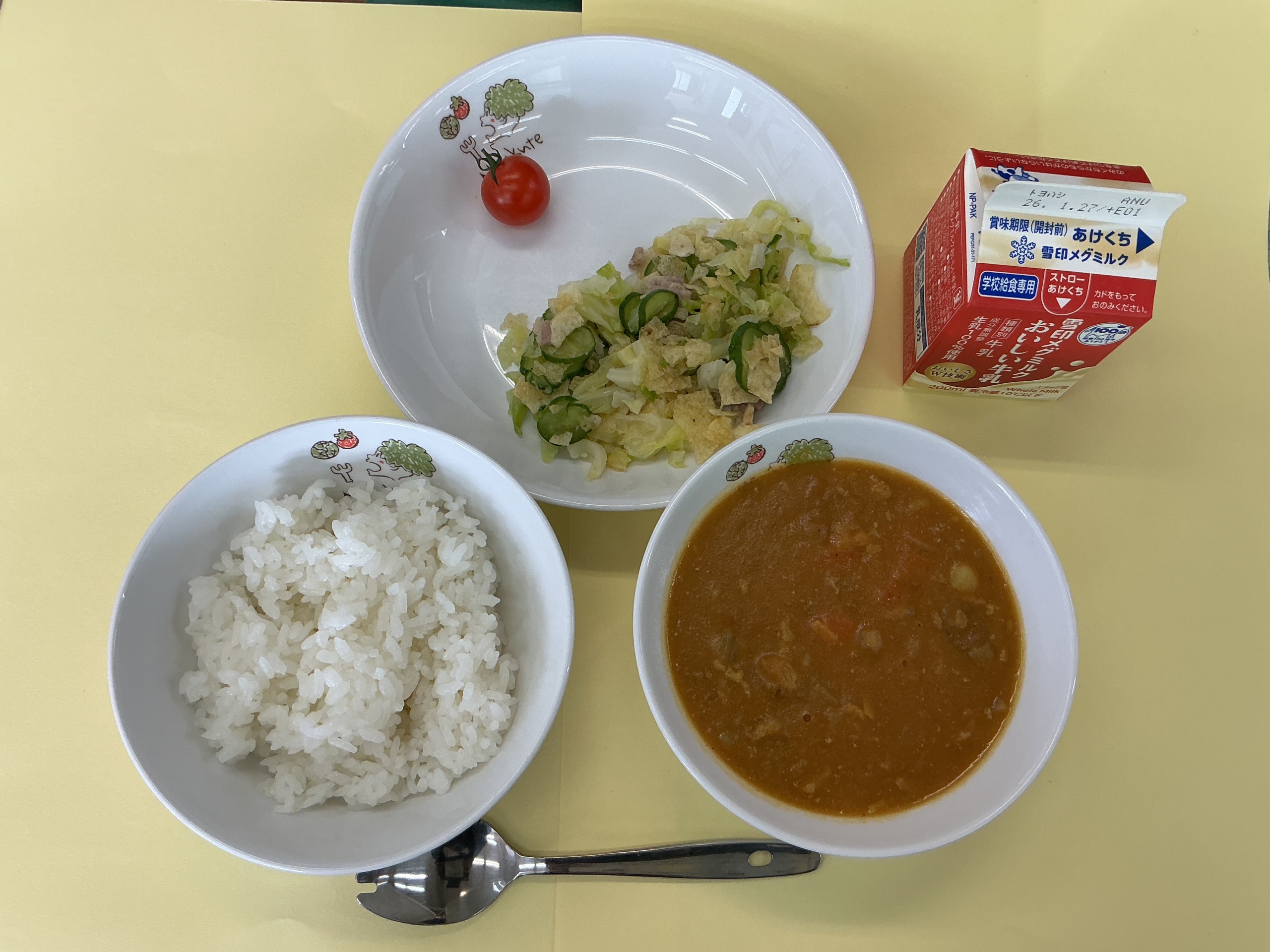 今日の給食はごはん、牛乳、カレーライス、ポテトチップスサラダ、ミニトマトでした。
