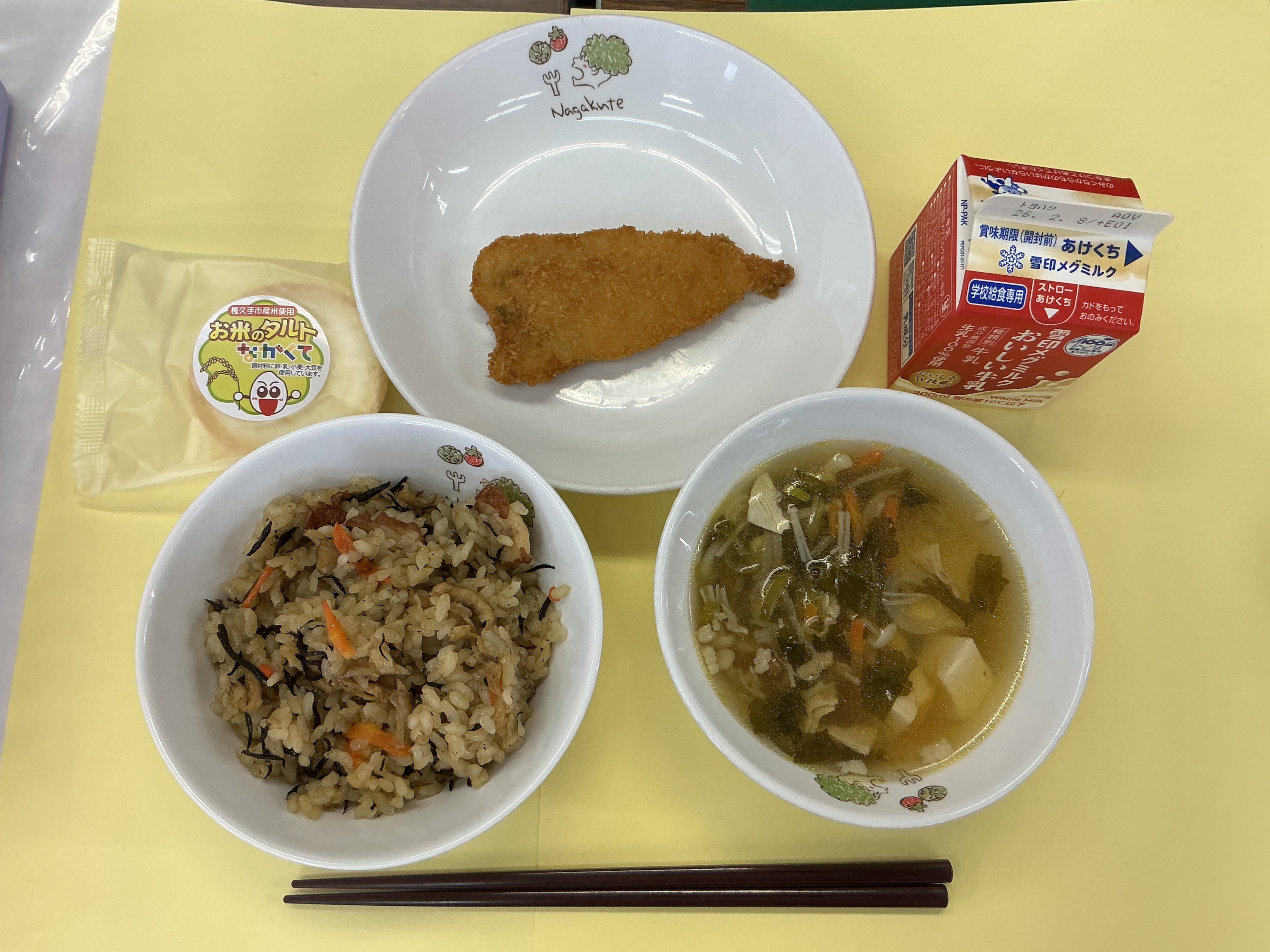 今日の給食は、ひじきごはん、牛乳、にぎすフライ、さわにわん、お米のタルトでした。