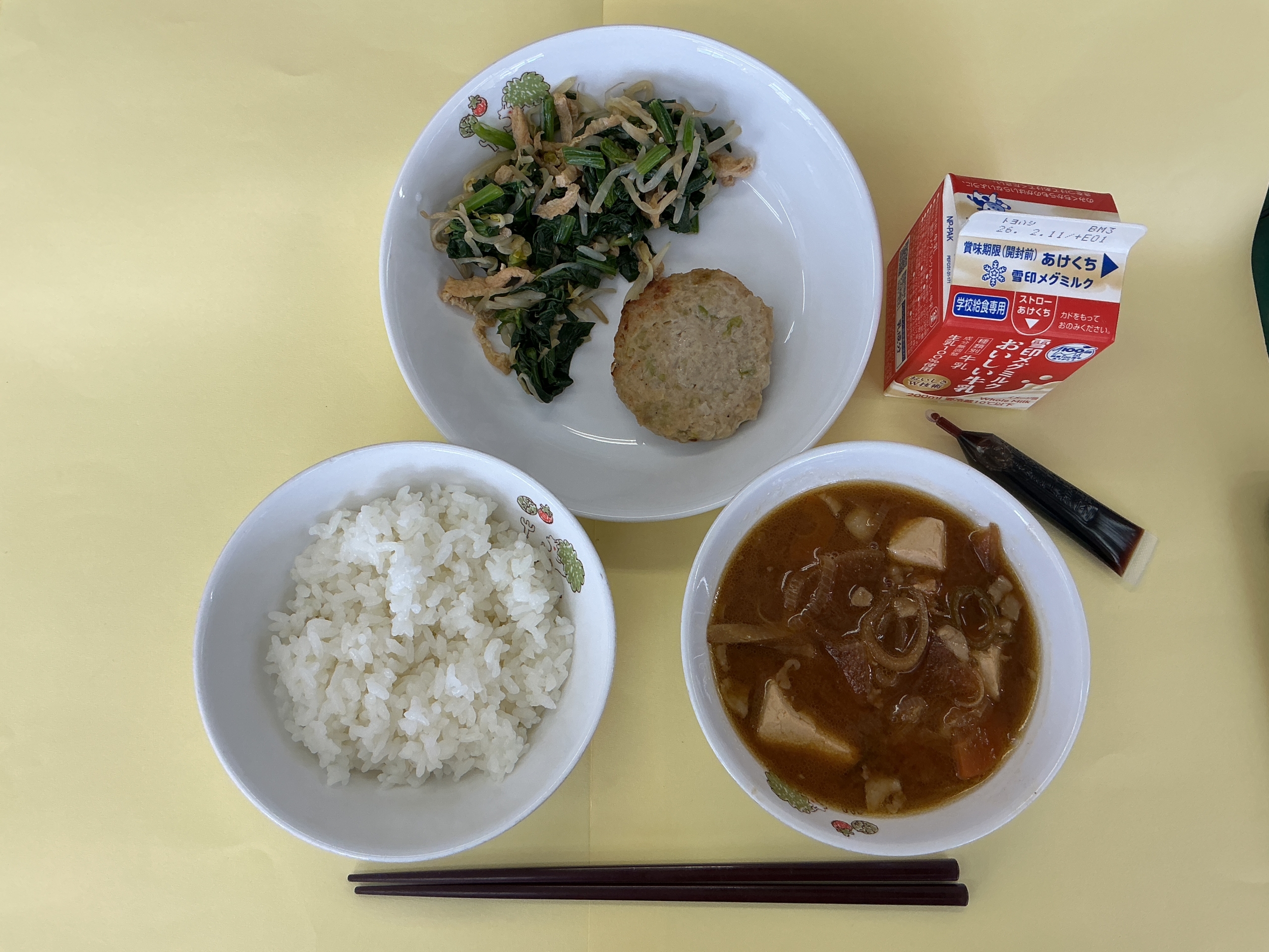 今日の給食は、ごはん、牛乳(コーヒー牛乳の素)、キャベツ入りつくね、千草あえ、豚汁でした。