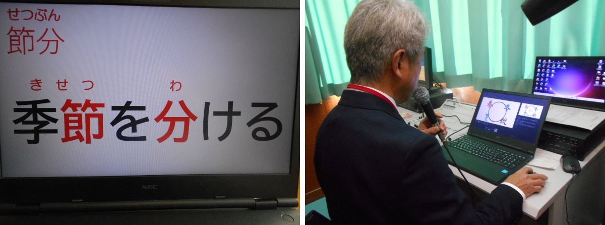 クイズを交えながら、地域によっては落花生をまくことや、節分の鬼には人の心の弱さを表す五色の鬼がいることを紹介しました。