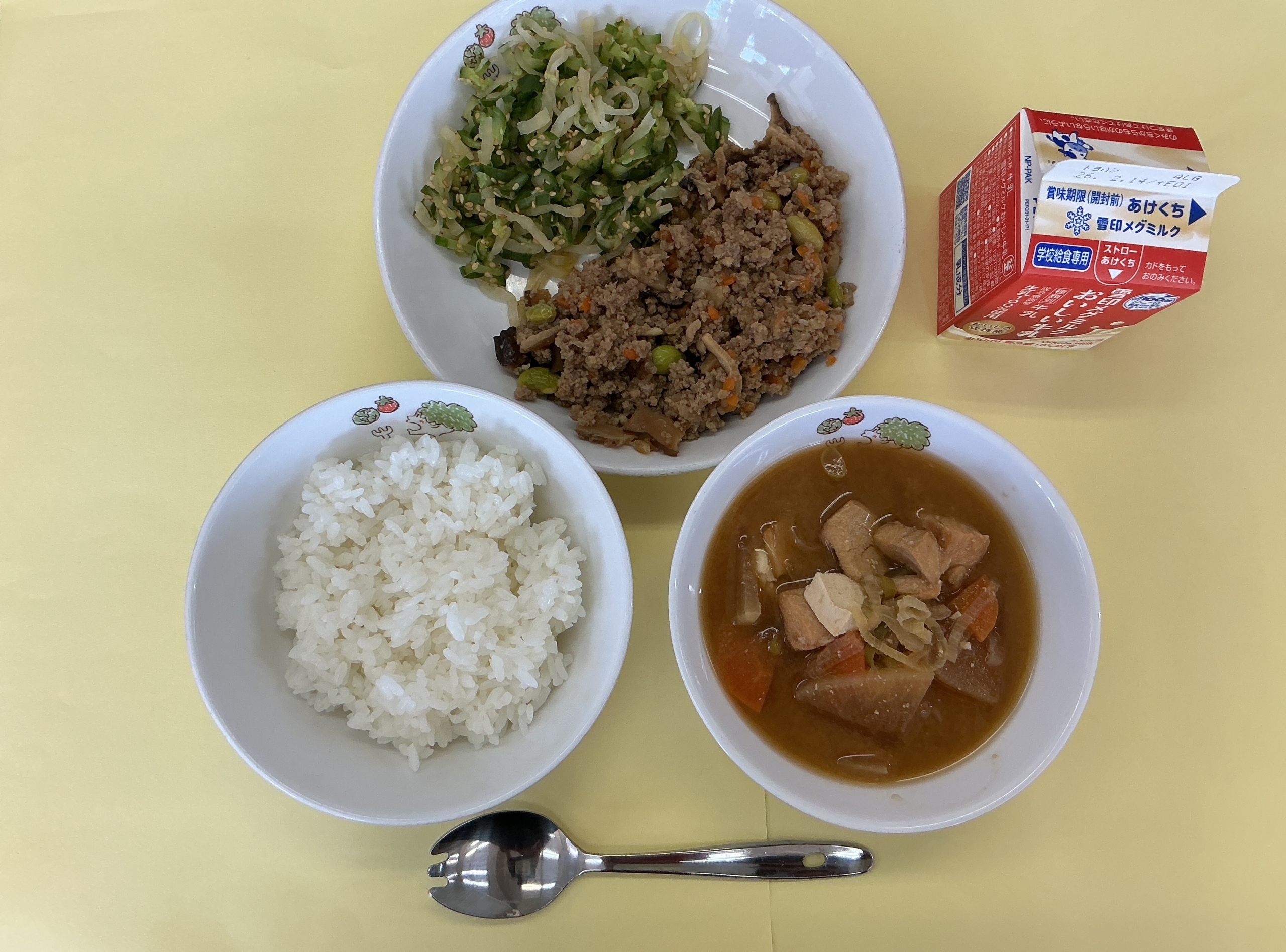 今日の給食はそぼろごはん、牛乳、はりはりづけ、石狩汁でした。