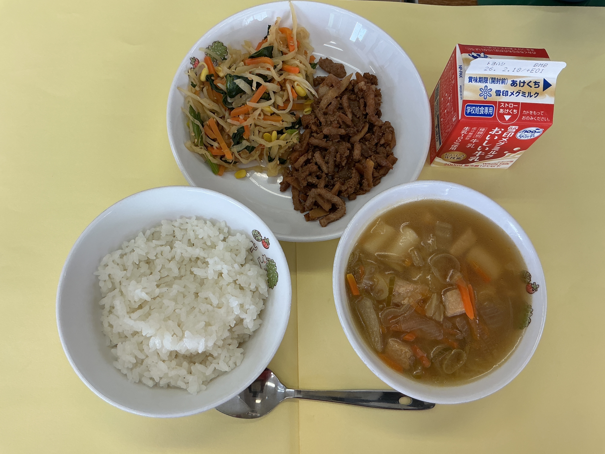 今日の給食はごはん、牛乳、ビビンバ(肉)、かみかみナムル、トッポギスープでした。