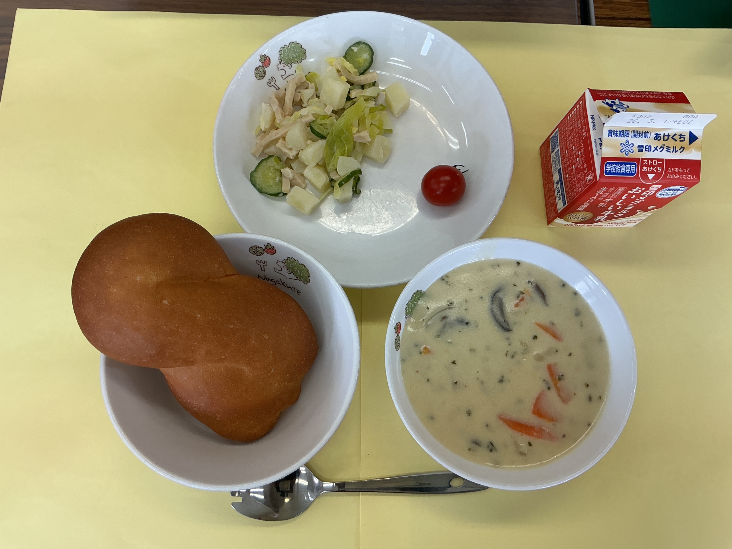今日の給食は、クロスロールパン、肉団子のシチュー、ポテトサラダ、ミニトマトでした。
