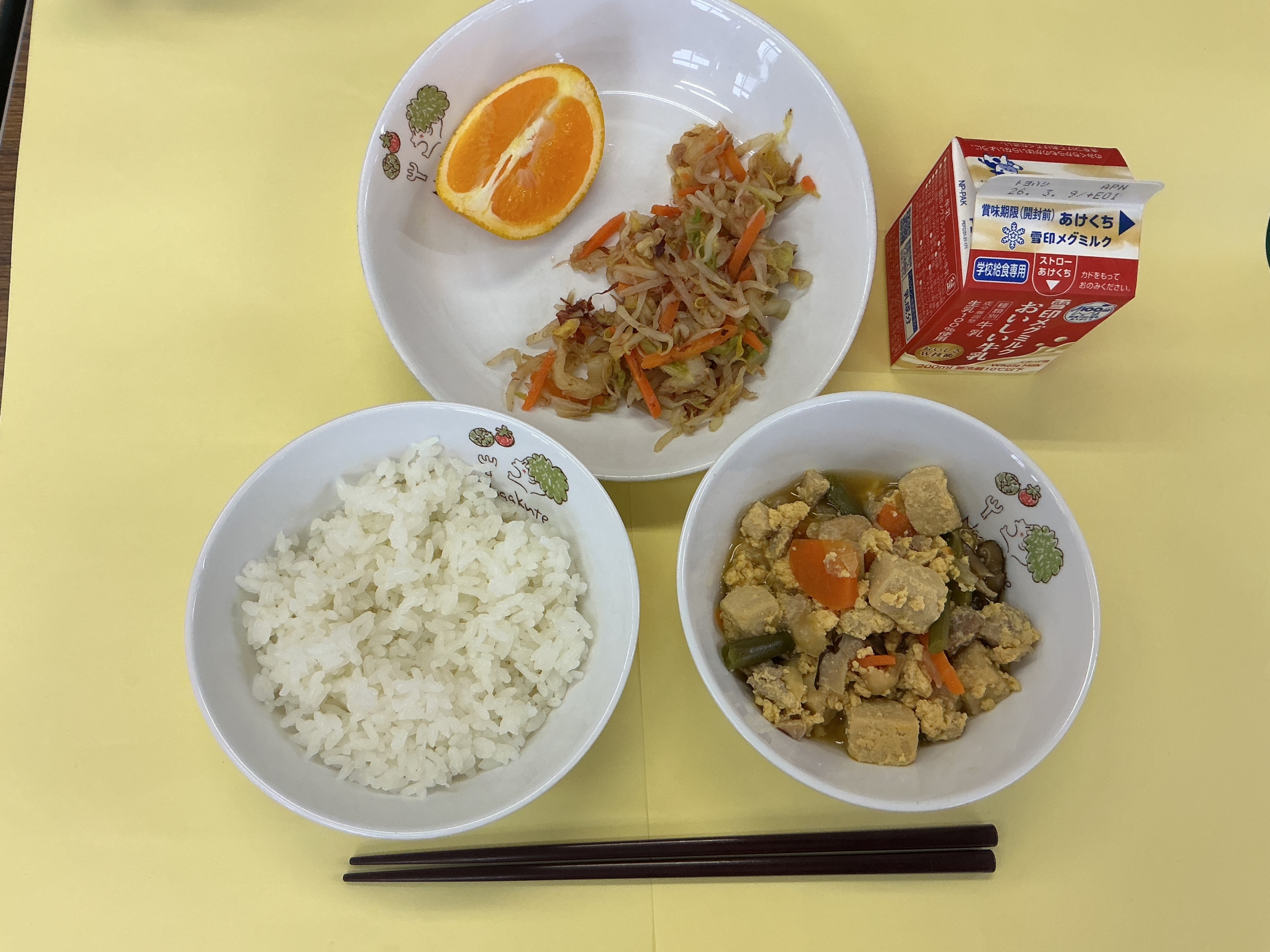 今日の給食は、ごはん、牛乳、高野豆腐の卵とじ、おかかあえ、清見オレンジでした。