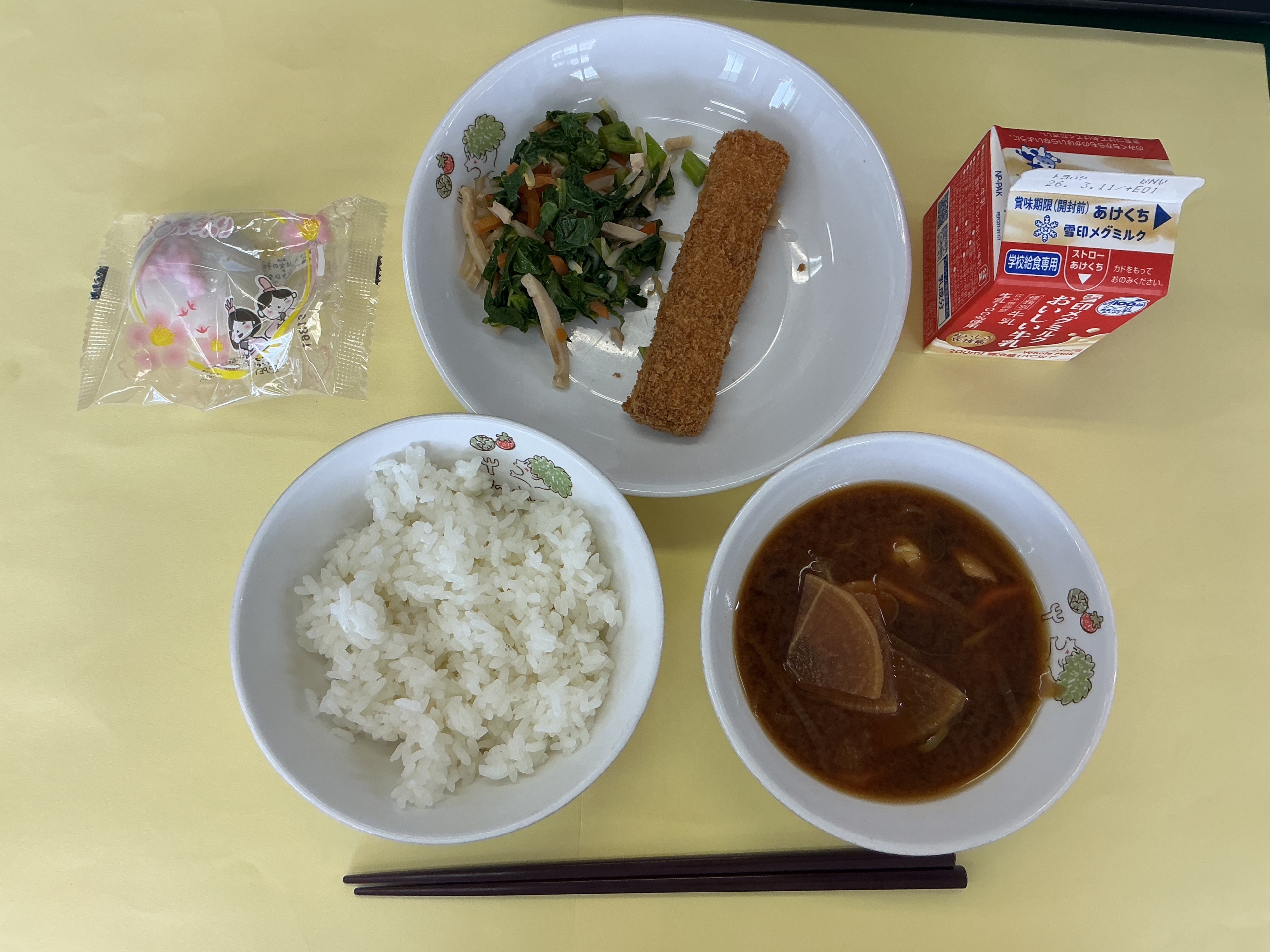 A:ごはん、牛乳、スティックメンチカツ、菜の花あえ、さつま汁、いがまんじゅう