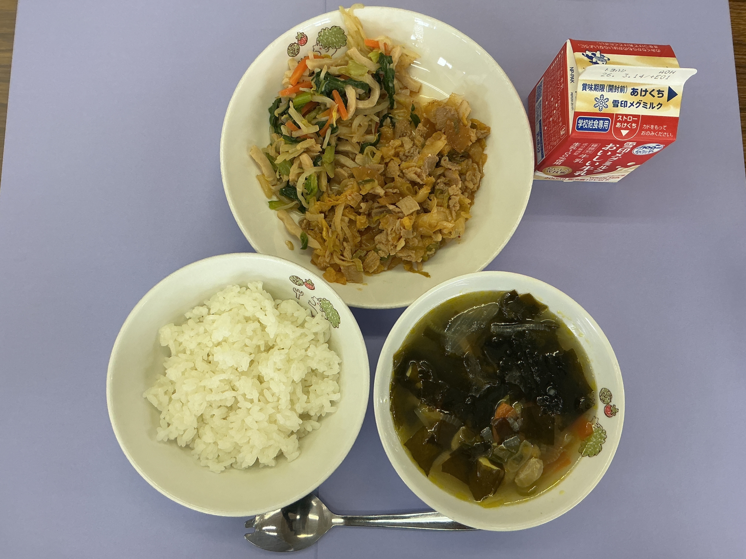 今日の給食は、キムタクごはん、牛乳、チンゲンサイのナムル、わかめスープでした。