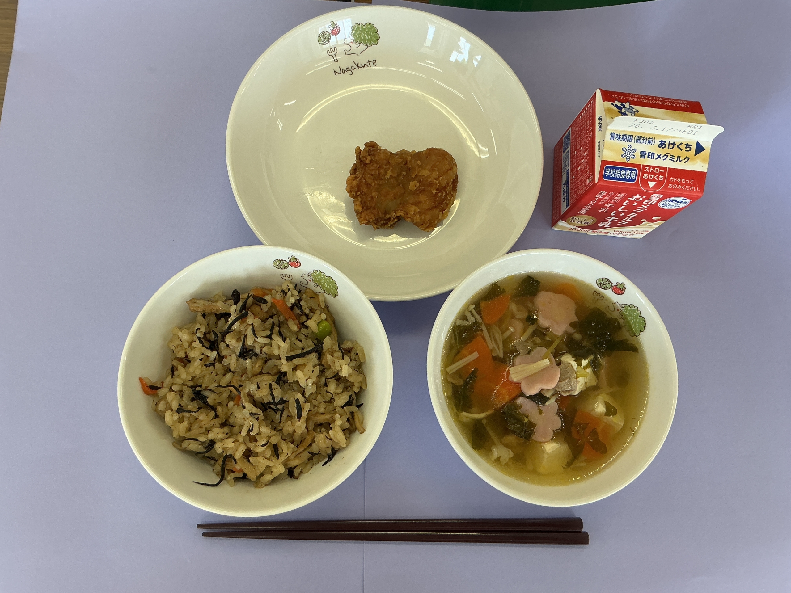 今日の給食はひじきごはん、牛乳、鶏のから揚げ、花かまぼこのすまし汁でした。