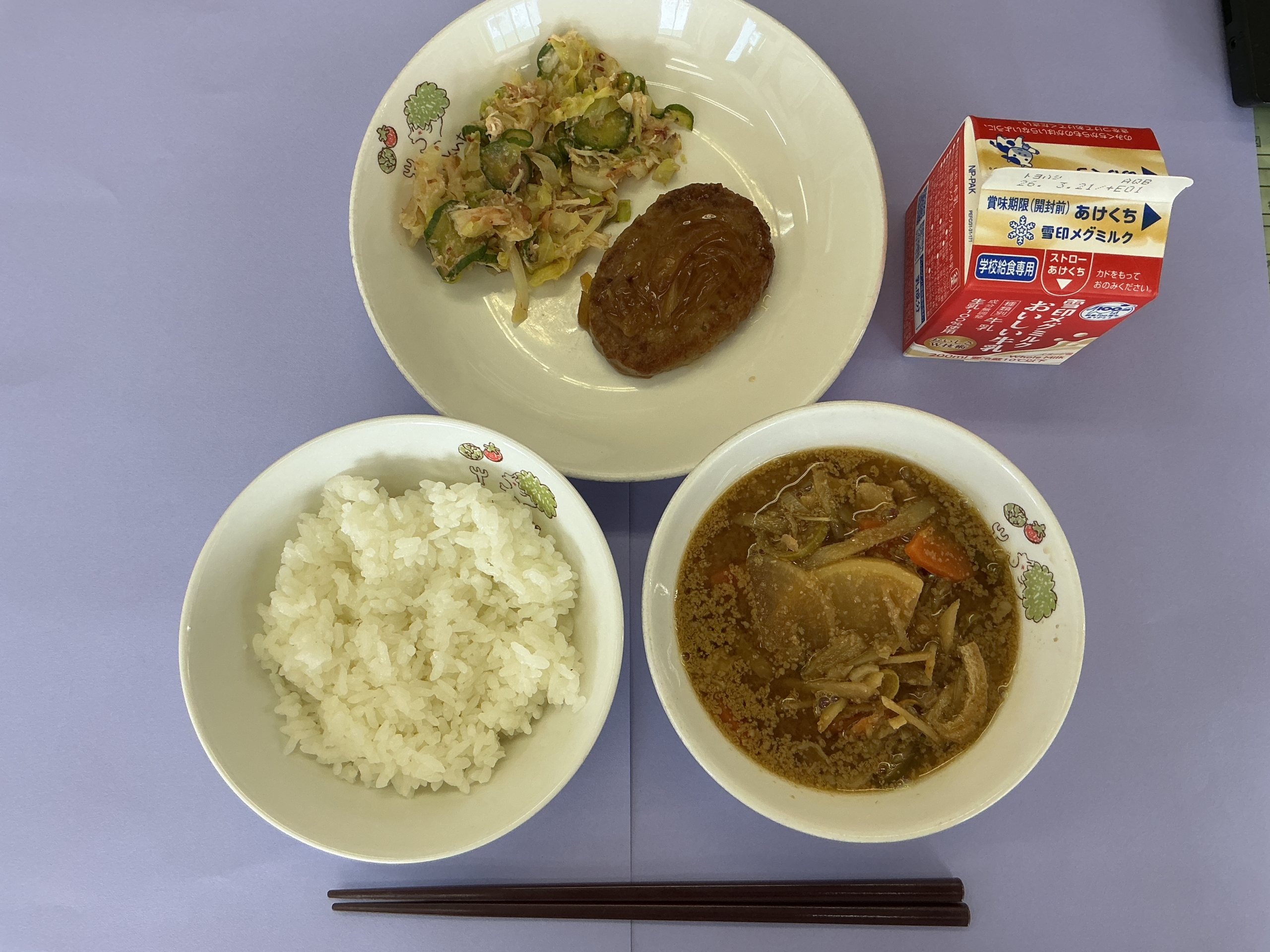 今日の給食は、ごはん、牛乳、ハンバーグのオニオンソースかけ、梅おかかあえ、根菜のごま汁でした。