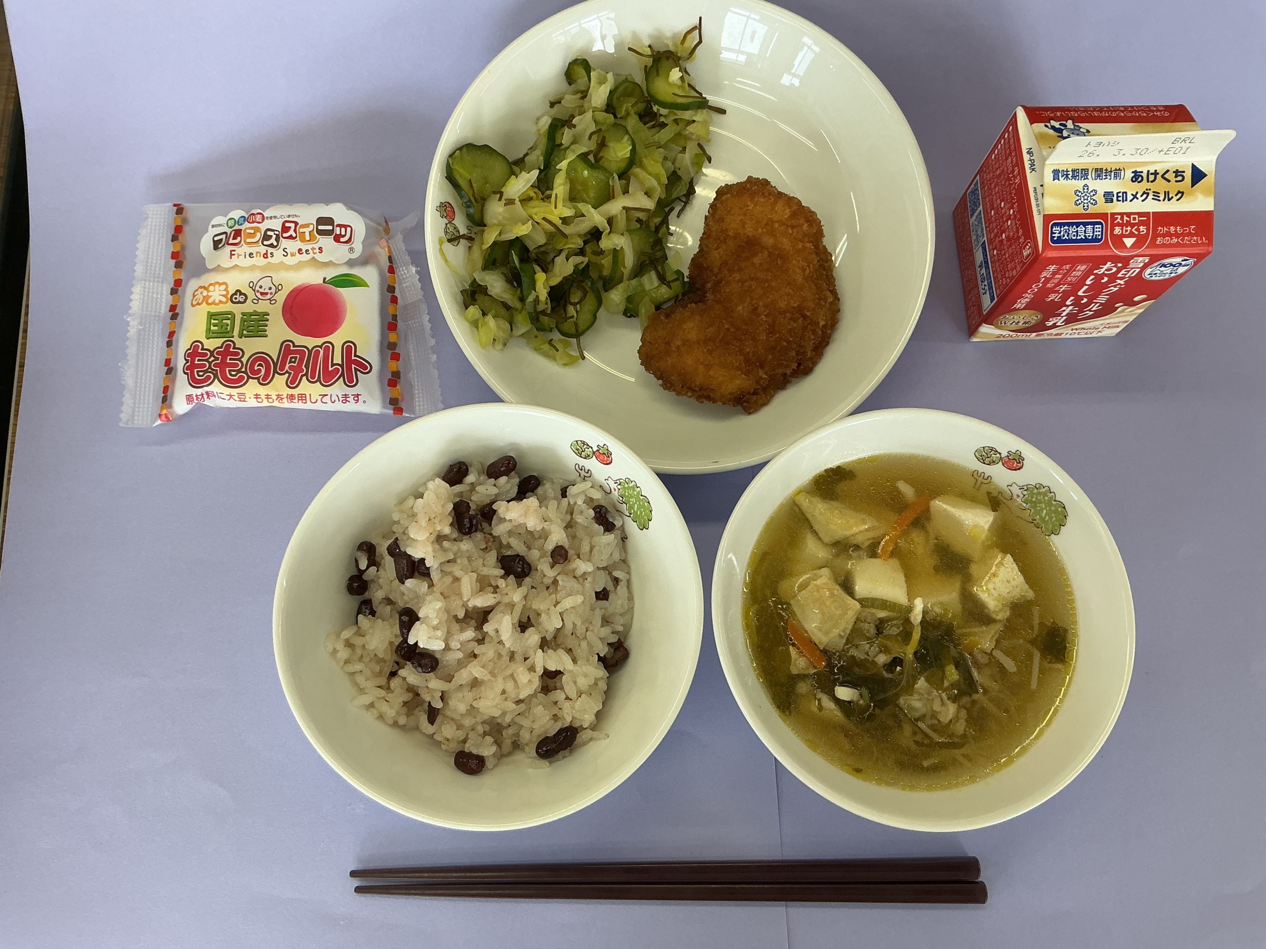 今日は6年生の卒業おいわい献立で赤飯と桃のタルトがつきました。