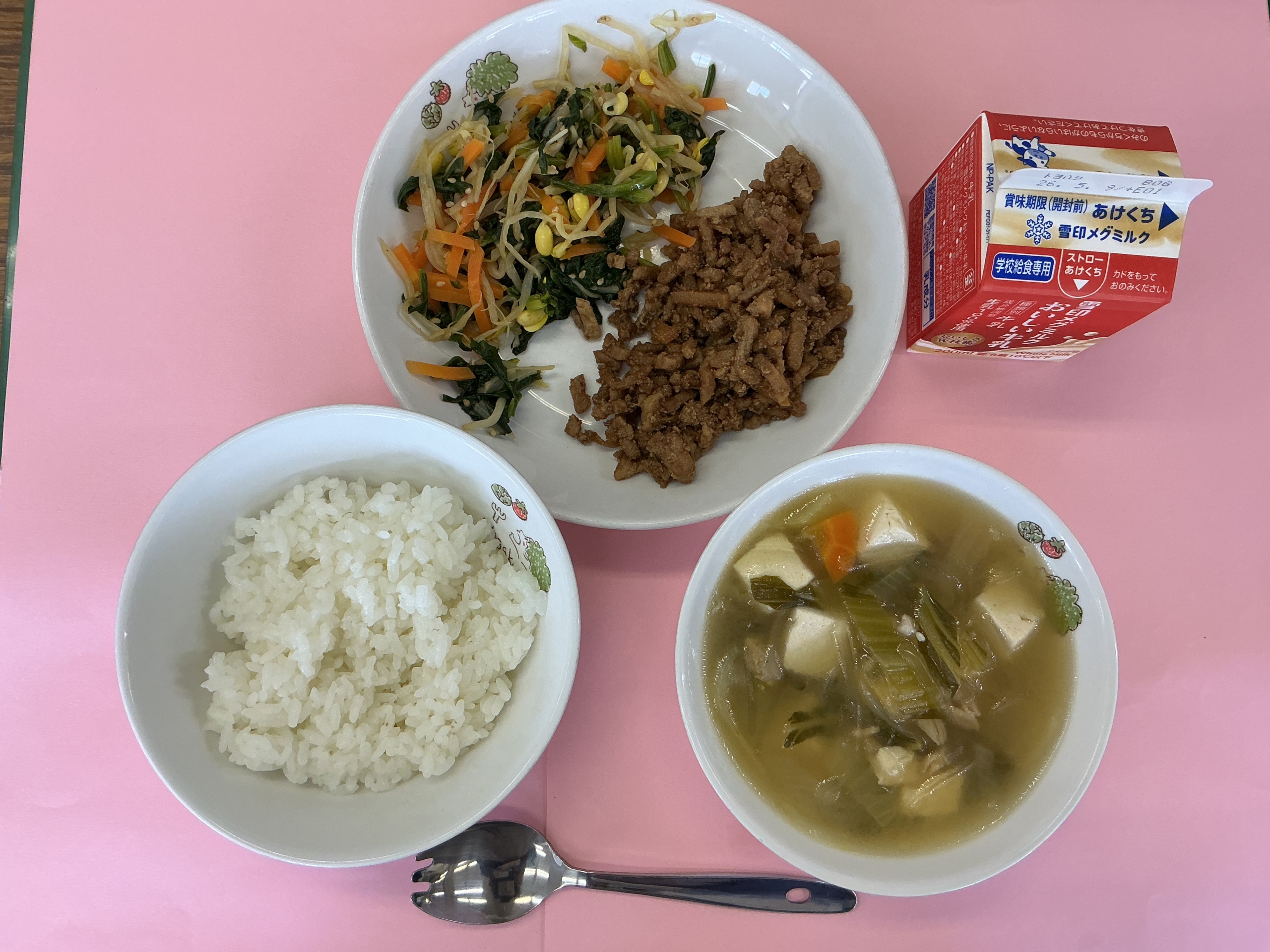 今日の給食は、ごはん、牛乳、ビビンバ(肉)、ビビンバ(野菜)、チンゲンサイのスープでした。