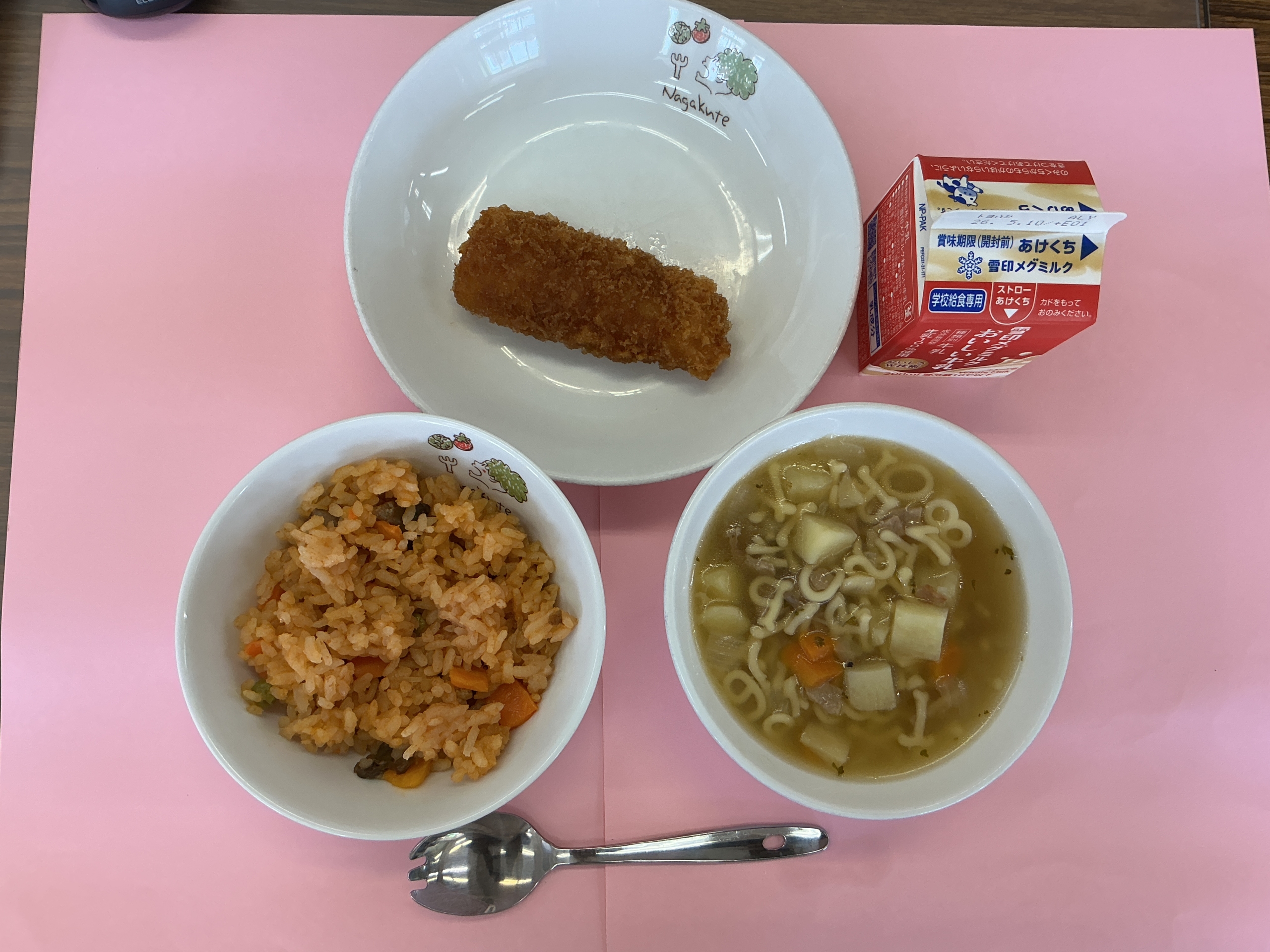 今日の給食は、チキンライス、牛乳、いかフライのレモンソース、ABCスープでした。